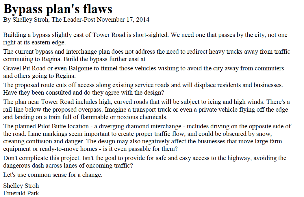 Insufficient weight has been given to valid concerns raised in regards to the location of the east Regina / Highway #1 Bypass that will impact taxpayers and everyone using the #1 Highway.